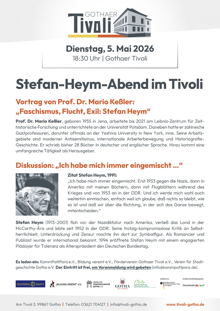 Es laden ein: Weimarer Rendez-vous mit der Geschichte in Kooperation mit der Stadt Gotha und dem Förderverein Gothaer Tivoli e.V. Der Eintritt ist frei.